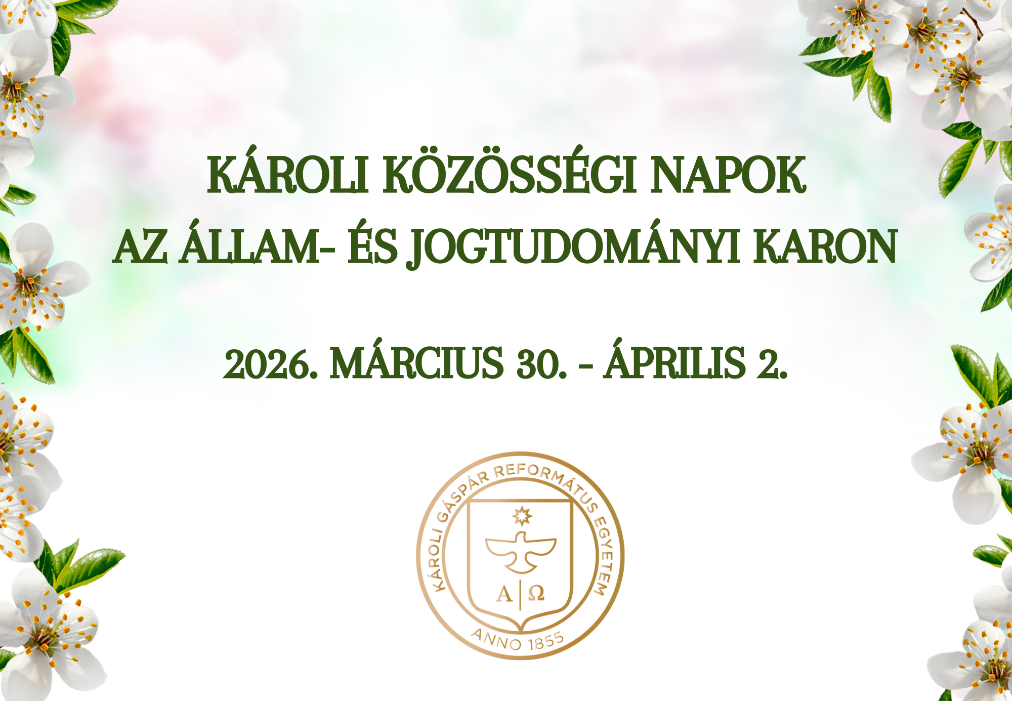 Örömmel tájékoztatjuk Hallgatóinkat, hogy az Egyetem vezetése a 2025-2026. tanév II. félévre ismét meghirdeti a Károli Közösségi Napok összegyetemi programsorozatot, 2026. március 30. – április 2. között.
