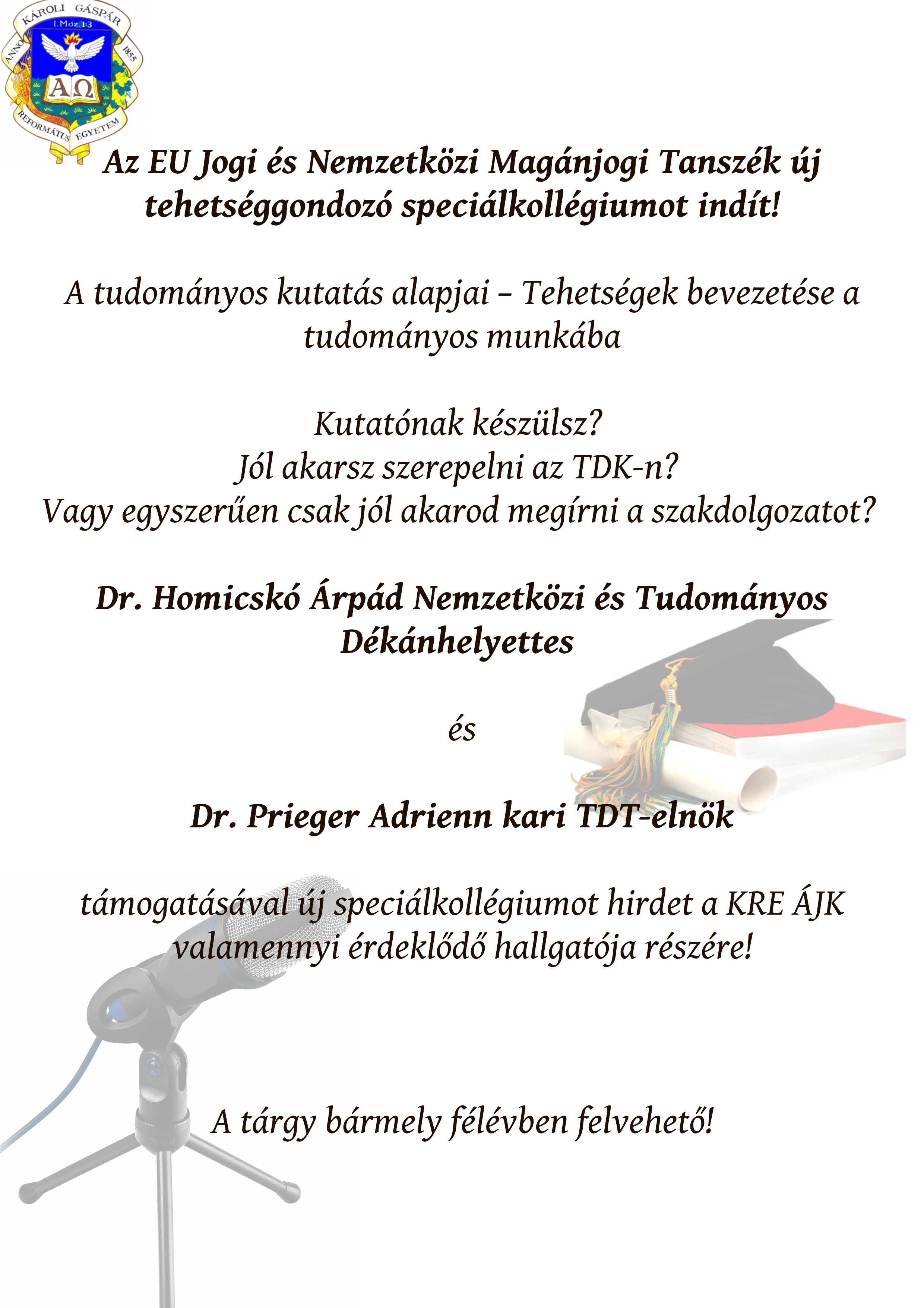 Az EU Jogi és Nemzetközi Magánjogi Tanszék új tehetséggondozó speciálkollégiumot indít, „A tudományos kutatás alapjai – Tehetségek bevezetése a tudományos munkába” címmel.