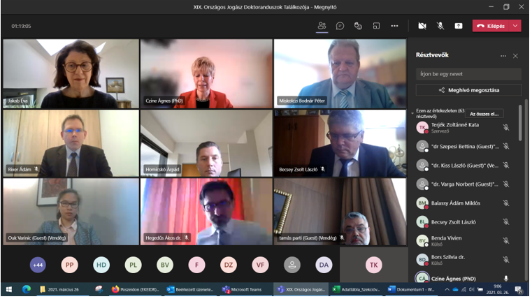 A Károli Gáspár Református Egyetem Állam- és Jogtudományi Karán 2021. március 26-án megrendezett doktorandusz konferencia kezdetén, legelőször Dr. habil. Czine Ágnes rektori feladatokkal megbízott rektorhelyettes asszony köszöntötte a résztvevőket és örömét fejezte ki, hogy 7 doktori iskolából, 55 doktorandusz jelentkezett. Dr. habil. Homicskó Árpád Olivér nemzetközi és tudományos dékánhelyettesi köszöntő emlékeztett arra, hogy a Kar immár XIX. alkalommal szervezte meg e jeles tudományos eseményt – bár ez az esemény a vírushelyzetre való tekintettel, online a Teams rendszeren keresztül zajlott. Valamit Prof. Dr. Jakab Éva, a KRE ÁJK Doktori Iskolájának vezetője is üdvözölte a megjelent doktoranduszokat.